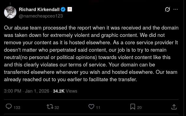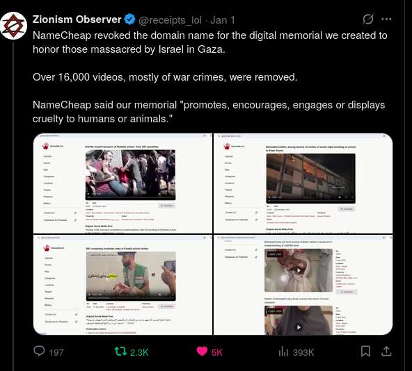 Namecheap, a domain registrar that is cheap in morals as well, revoked the domain genocide.live just before the start of 2026. The website genocide.live, owned by the group Zionism Observer, was hosting thousands of video evidence of Israeli war crimes, including the ambushing and massacre of healthcare workers and beheadings of children. It naturally contained graphic content, but archiving and disseminating this information was essential to prevent the truth from being lost. Hundreds of Palestinian journalists were murdered for sharing these footages, as Israel is actively destroying evidence on the ground and Big Tech social media platforms are banning and censoring Palestinian accounts.