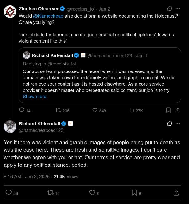 The importance of this archival work is clear. The website was referenced in a UN submission to the Committee Against Torture and in the International Court of Justice case against Israel. Namecheap essentially destroyed the links used in these courts, hindering prosecution and aiding the defense of the genocidal state of Israel.