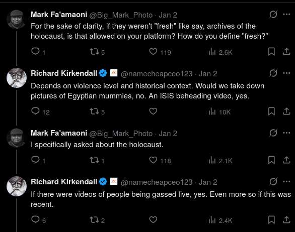 After being asked if this would also apply to a Holocaust memorial website, Richard Kirkendall doubled down on their decision. He also pathetically tried to create a distinction between the types of violent imagery that would be a reason for them to steal domains, making it clear that their reasoning is arbitrary and they could take domains when it suits them.