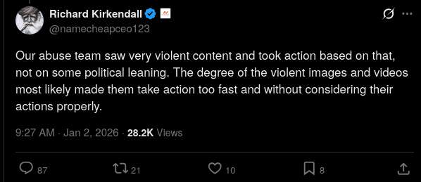 The backlash was too much for Kirkendall to handle, who later stated that their moderator "took action too fast and without considering actions properly," insinuating that the decision was a mistake. However, Namecheap never issued an apology.